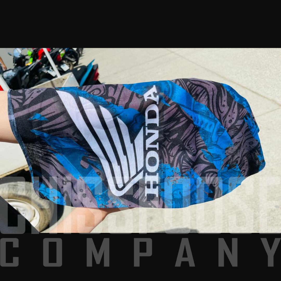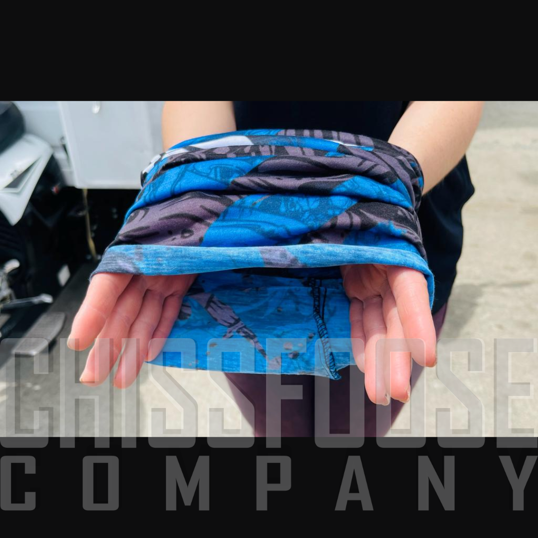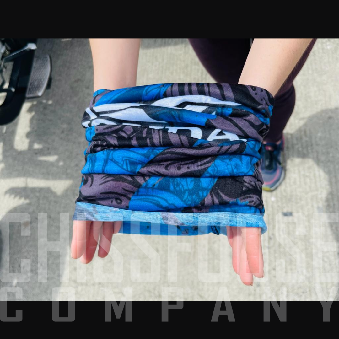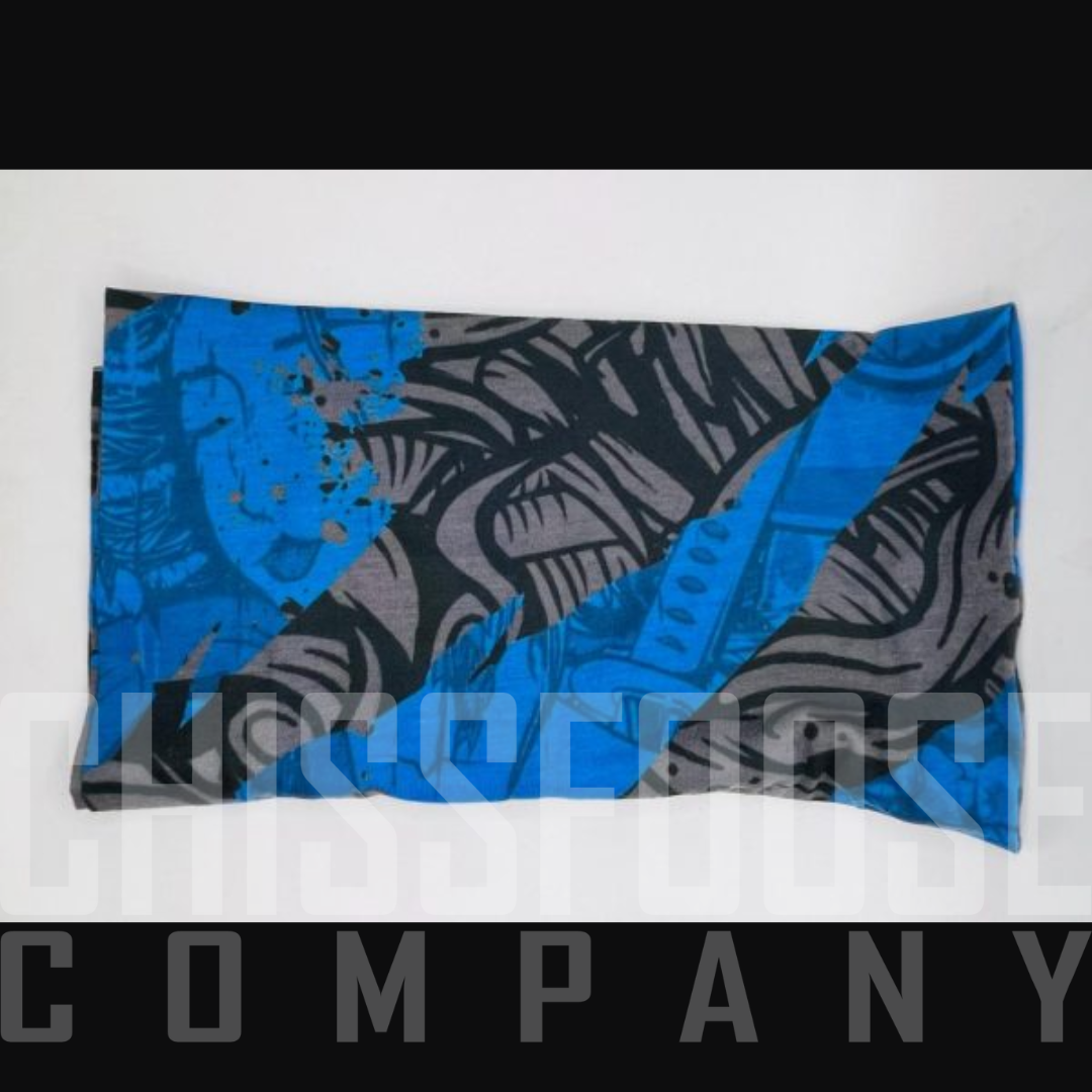 BUFF CON UN DISEÑO ESTAMPADO EN COLORES GRIS OSCURO Y AZUL MARINO.